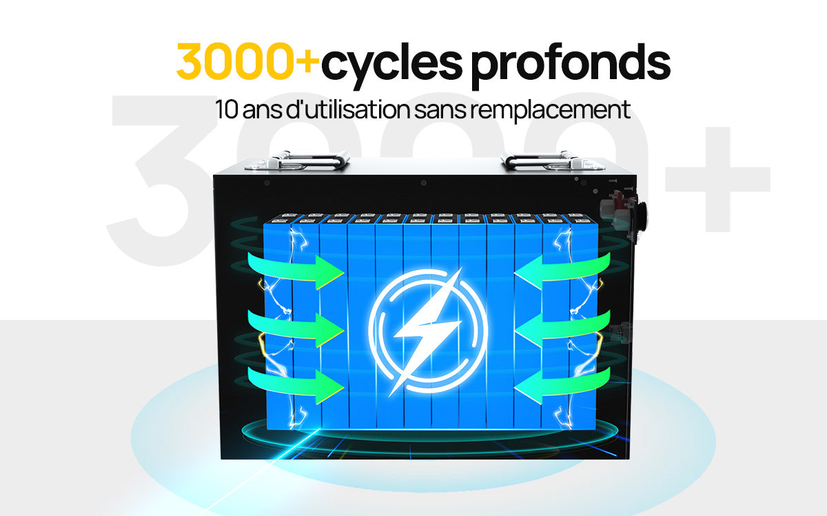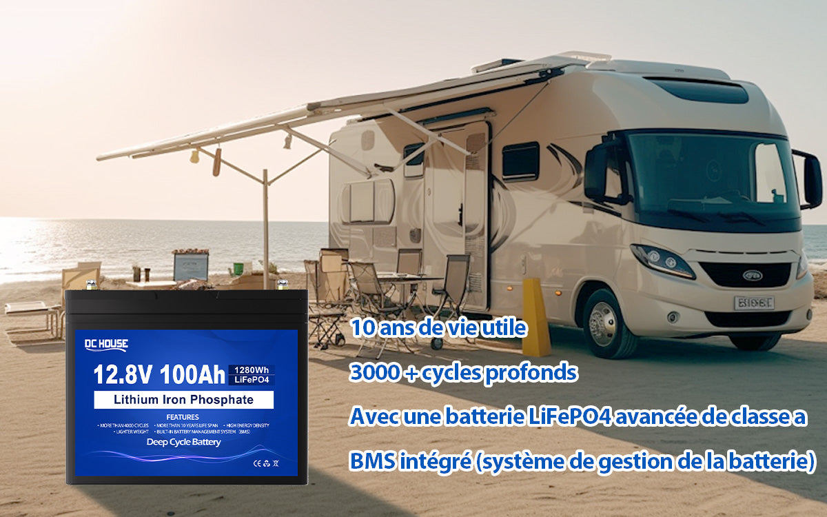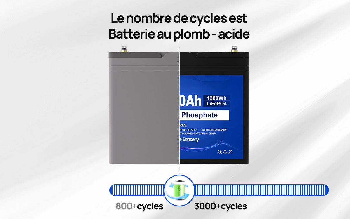 - La batterie au phosphate de fer lithium (LiFePO4) DC HOUSE 12v 100ah peut être soumise à un cycle profond de plus de 3000 fois, et la batterie au phosphate de fer lithium (LiFePO4) 24v 100ah peut être cyclée plus de 4000 fois pour obtenir une plus longue durée de cycle.