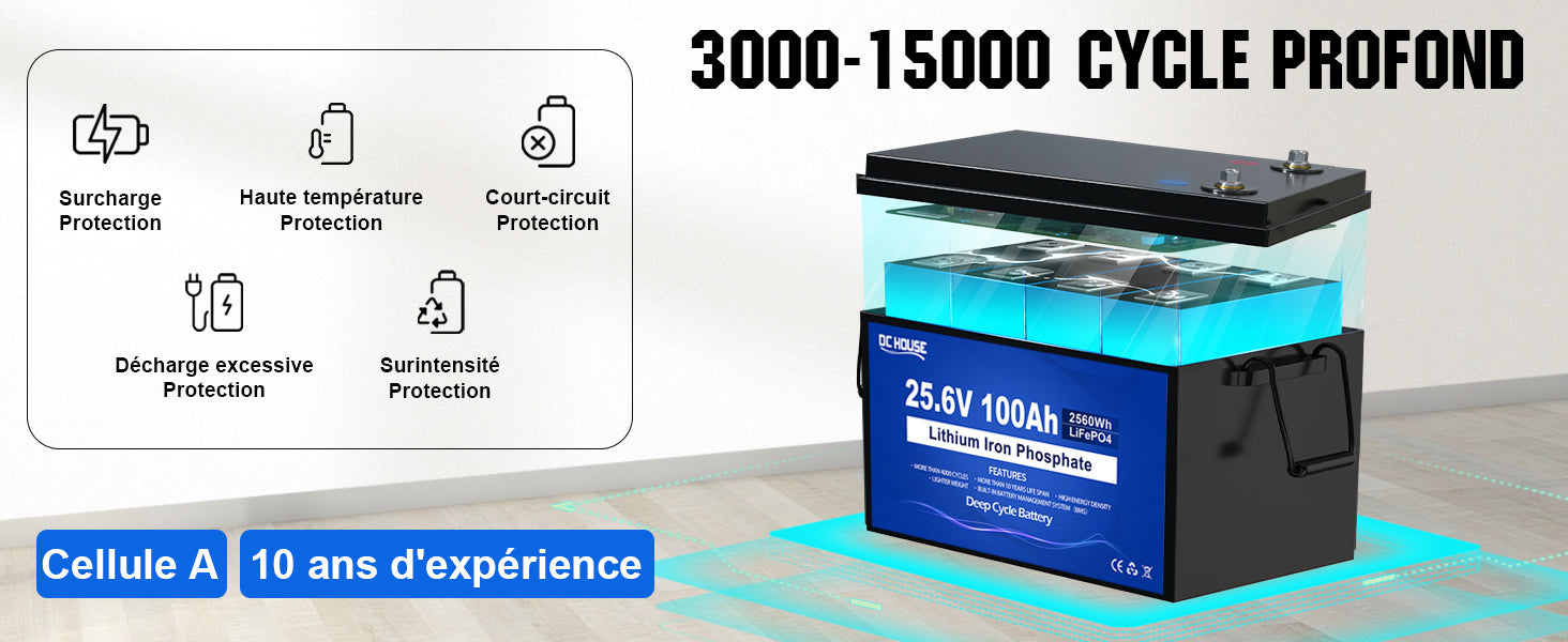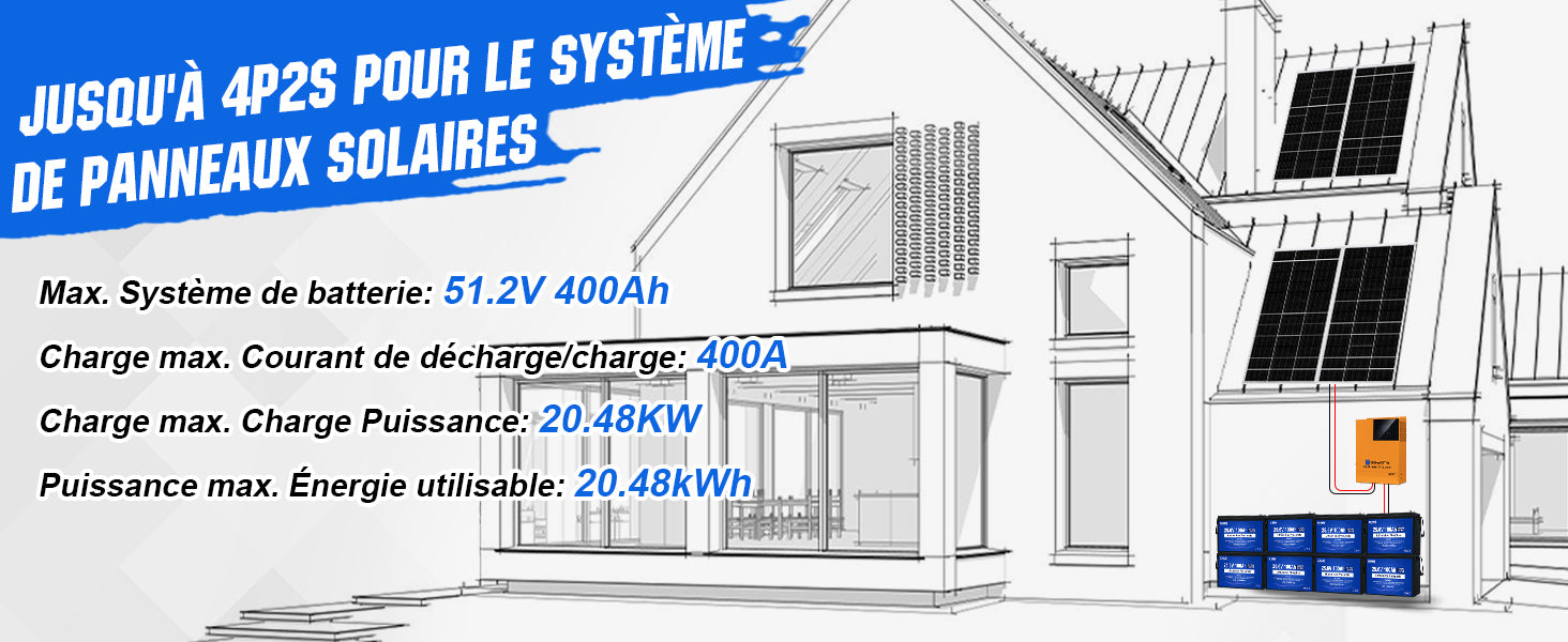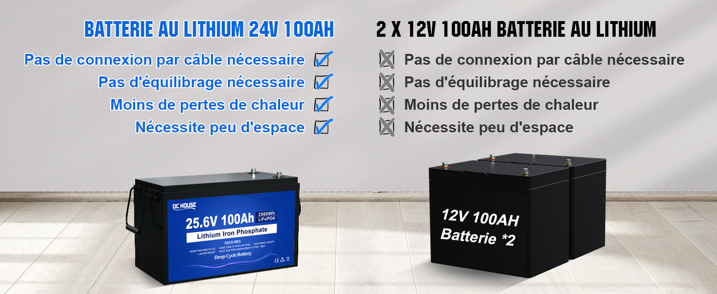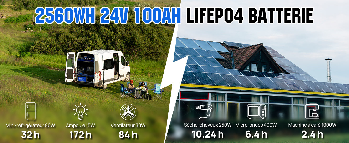 Capacité de la batterie en Wh | 2560 Wh (25,6V * 100Ah) |