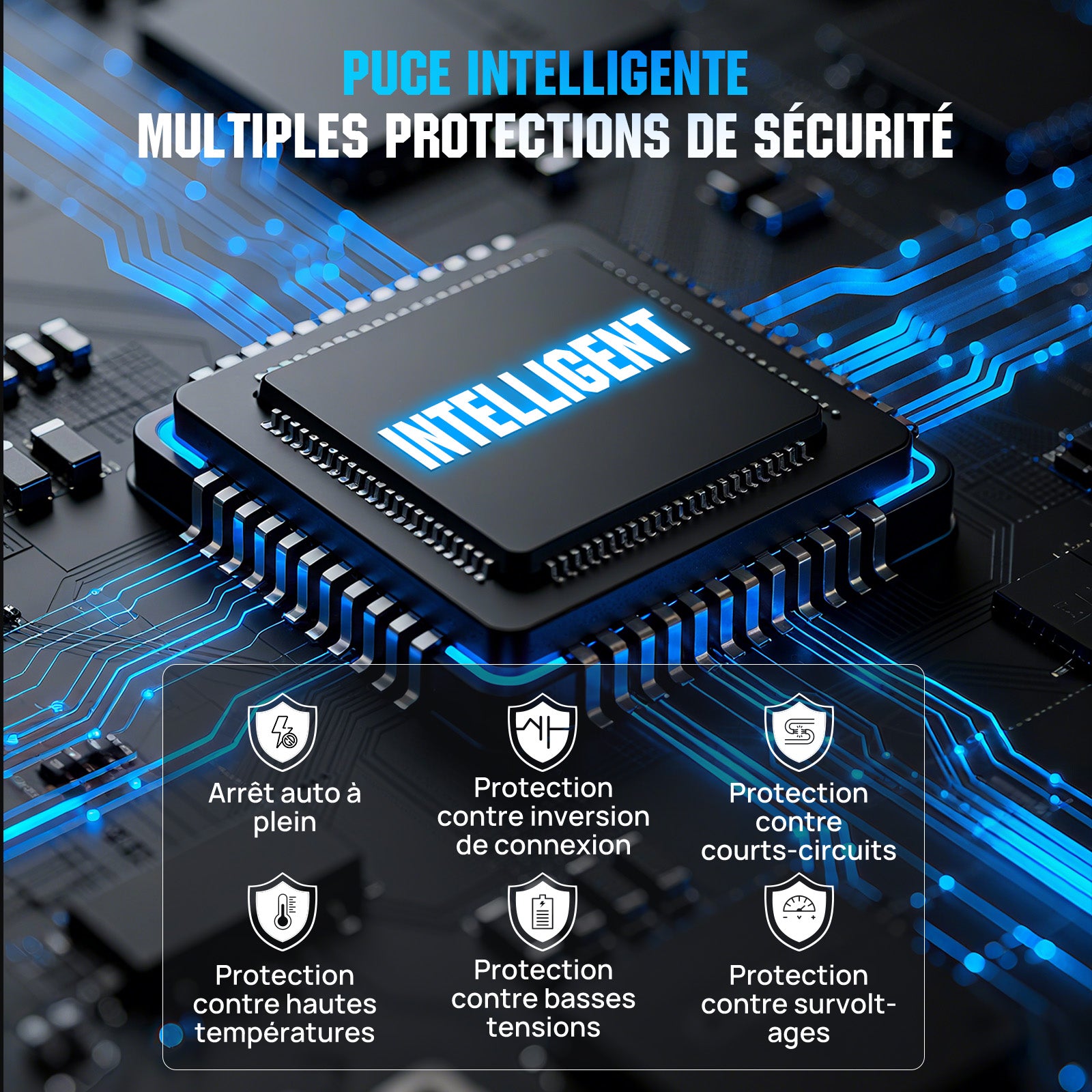 | Fonctions de protection | Court-circuit, inversion de polarité, surtension |